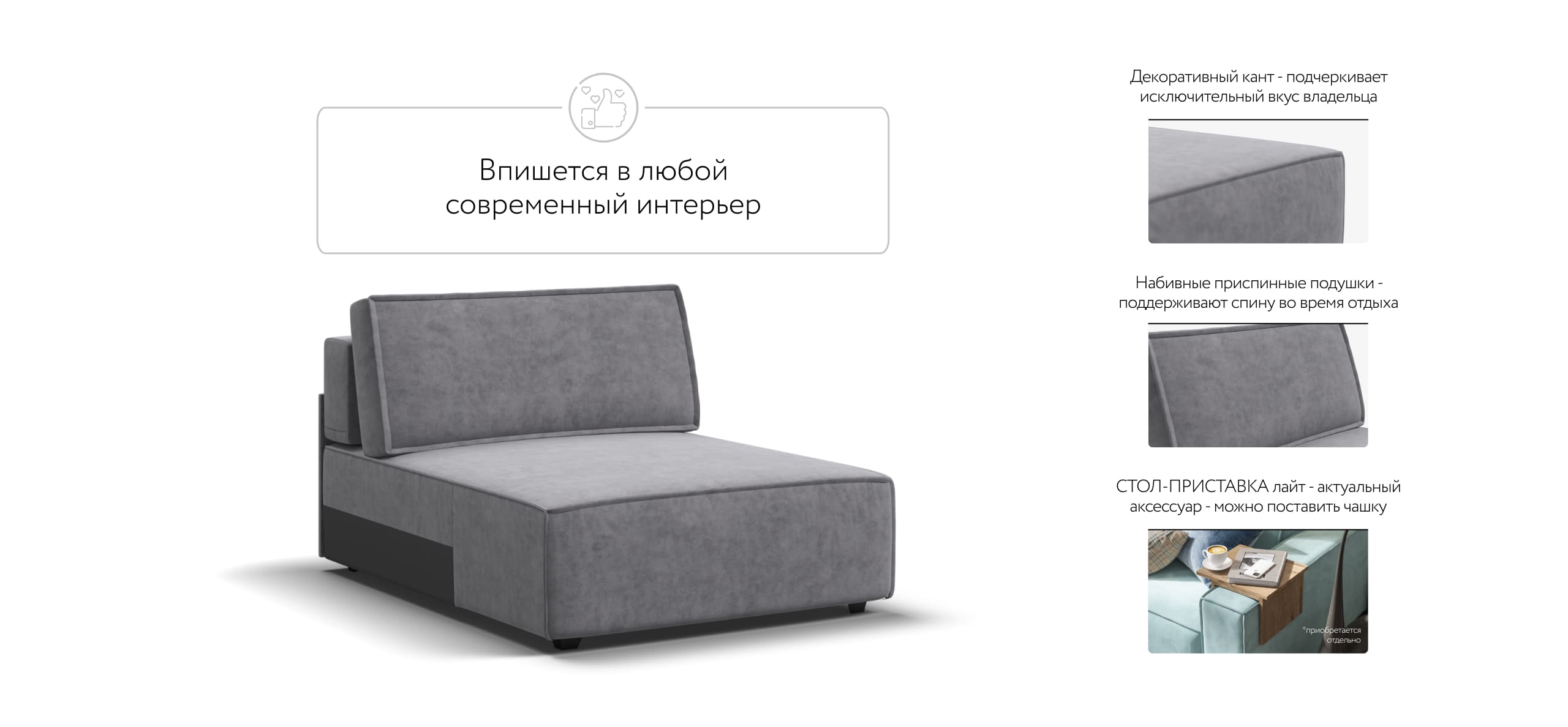 Оттоманка Босс Софт Модуль является частью модульной системы. Универсальная оттоманка может быть установлена с любой стороны комплектации. Мягкие приспинные подушки и высокоэластичная пена с дополнительным слоем Периотек создадут максимальный комфорт во время отдыха.