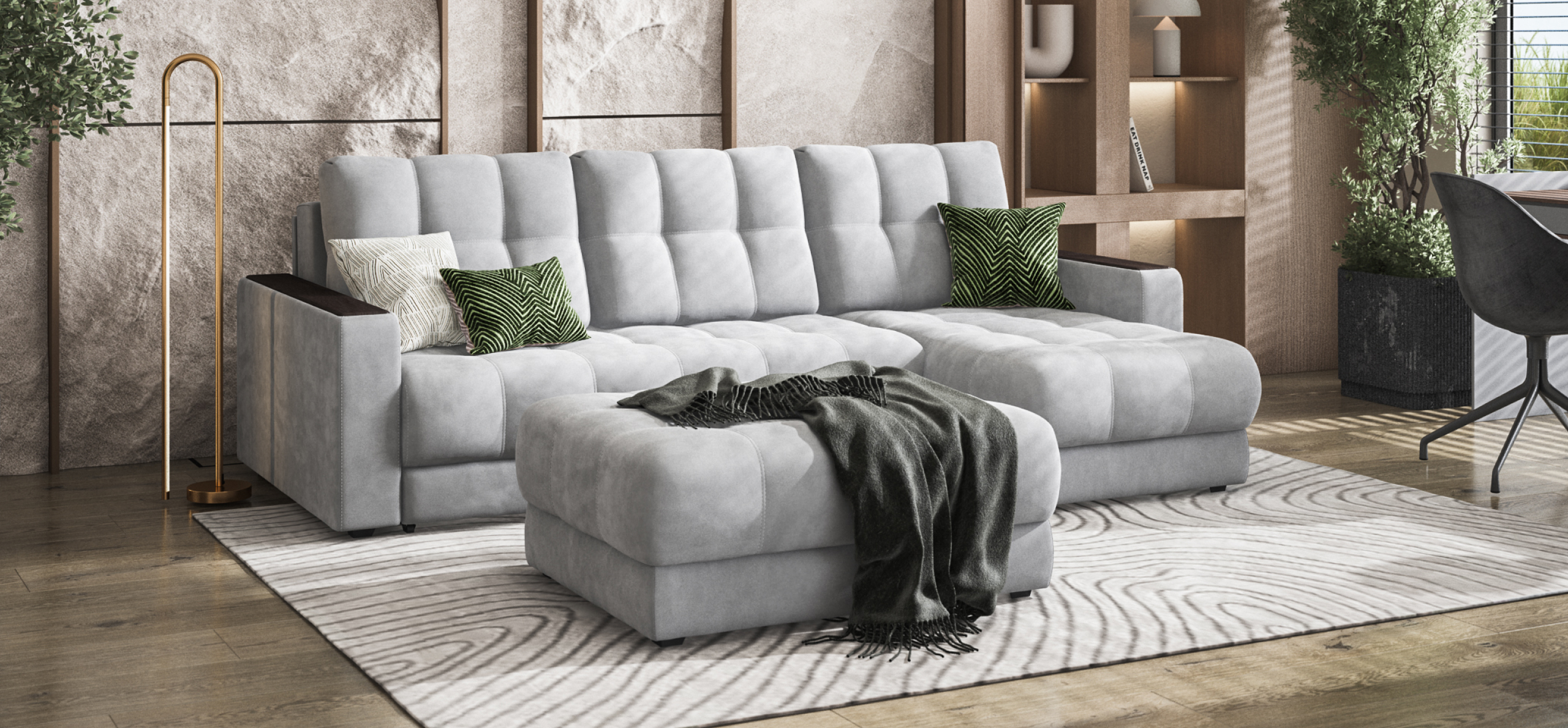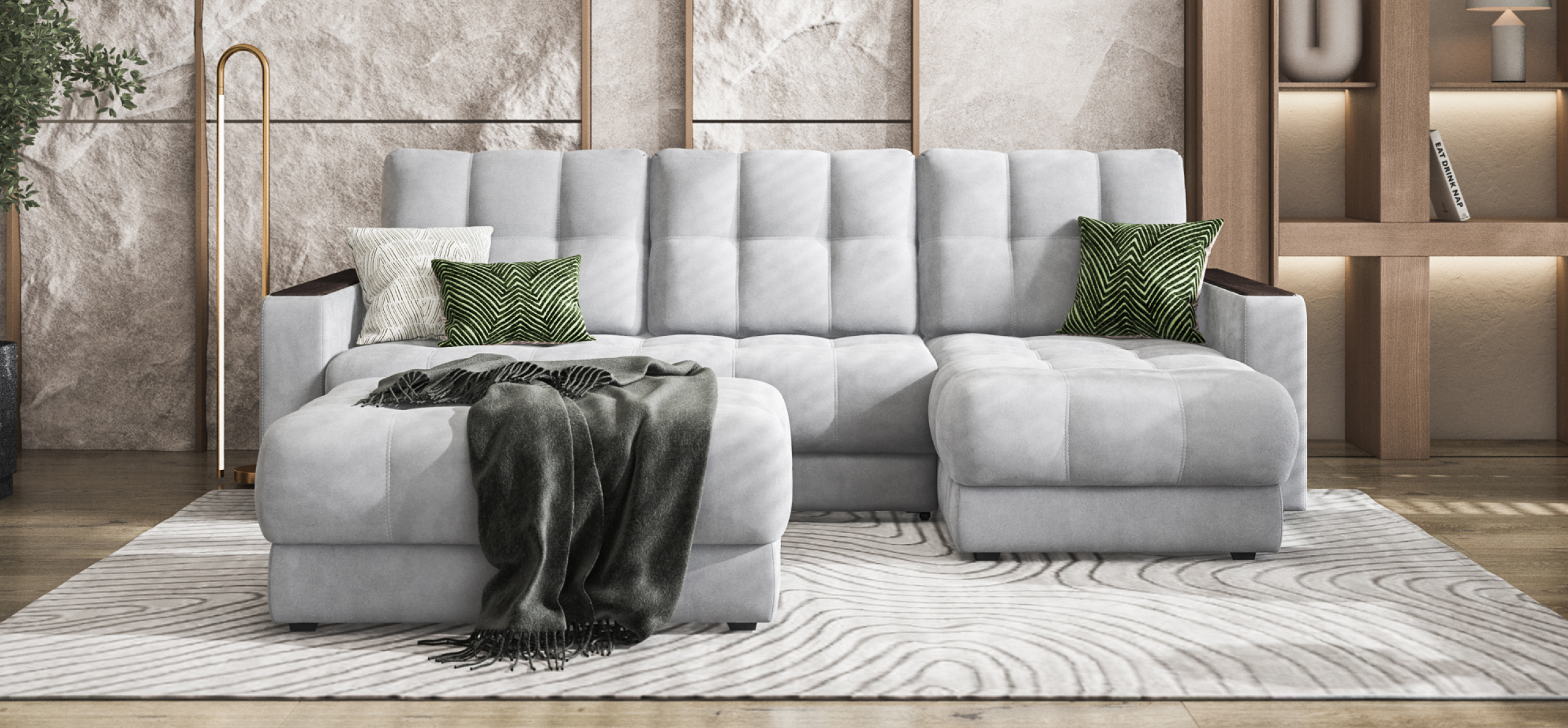 Преимущества материалаВодоотталкивающая пропитка Water RepellentВысокая стойкость к истиранию - 40 000 цикловГипоаллергенный материалТактильно приятный, мягкий ворс