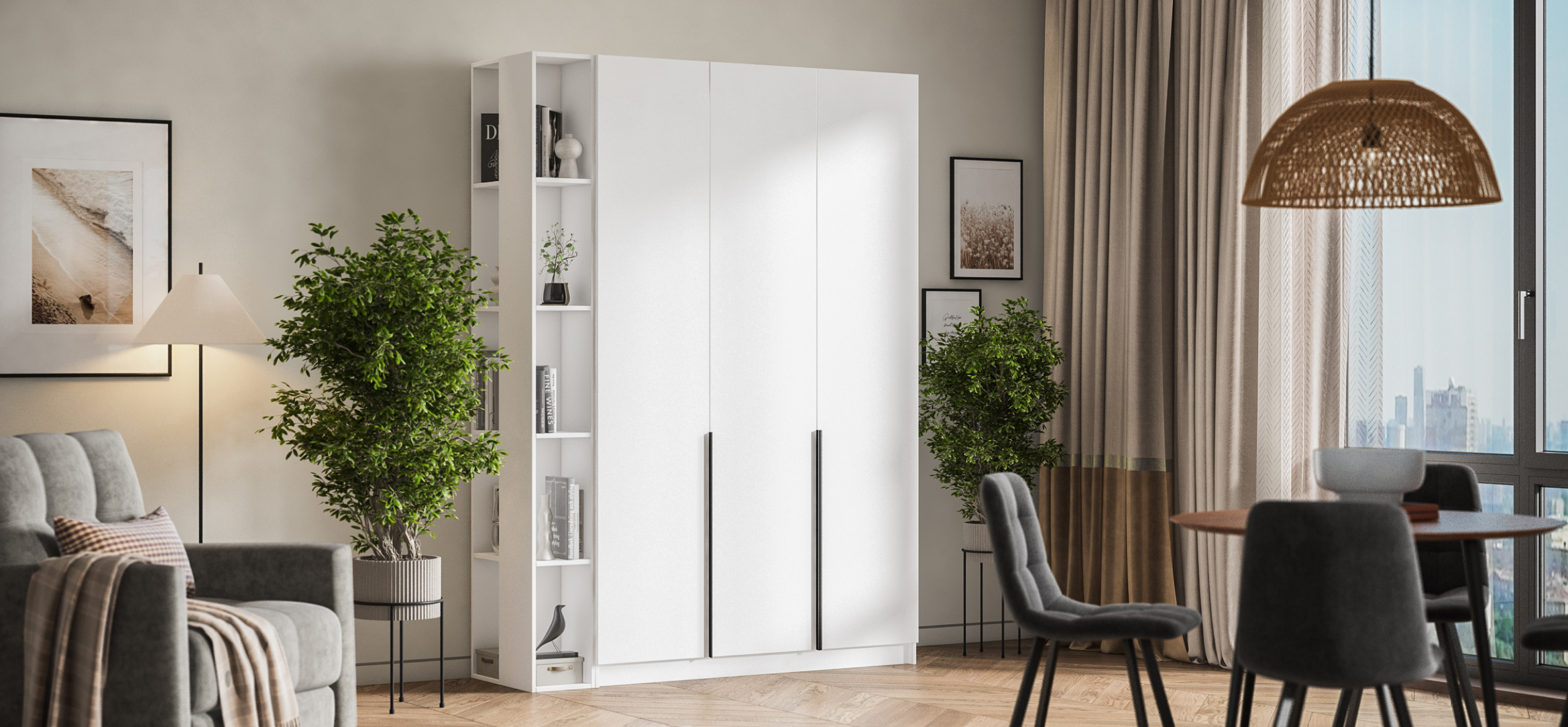 Модульное решение расширяет систему хранения без увеличения глубины и визуального веса, завершая композицию и придавая интерьеру законченный, гармоничный вид.