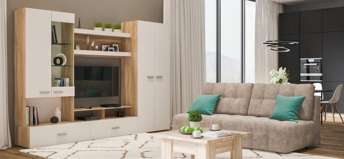 Виго – современная минималистичная стенка, которая сочетает в себе стеклянную витрину со стеклянными полками, откидные ящики, полноценный платяной шкаф с металлической штангой, а также просторную ТВ нишу. Классическое цветовое решение – сочетание двух оттенков привлекает взгляд своим стильным контрастом и делает эту стенку изюминкой в интерьере.