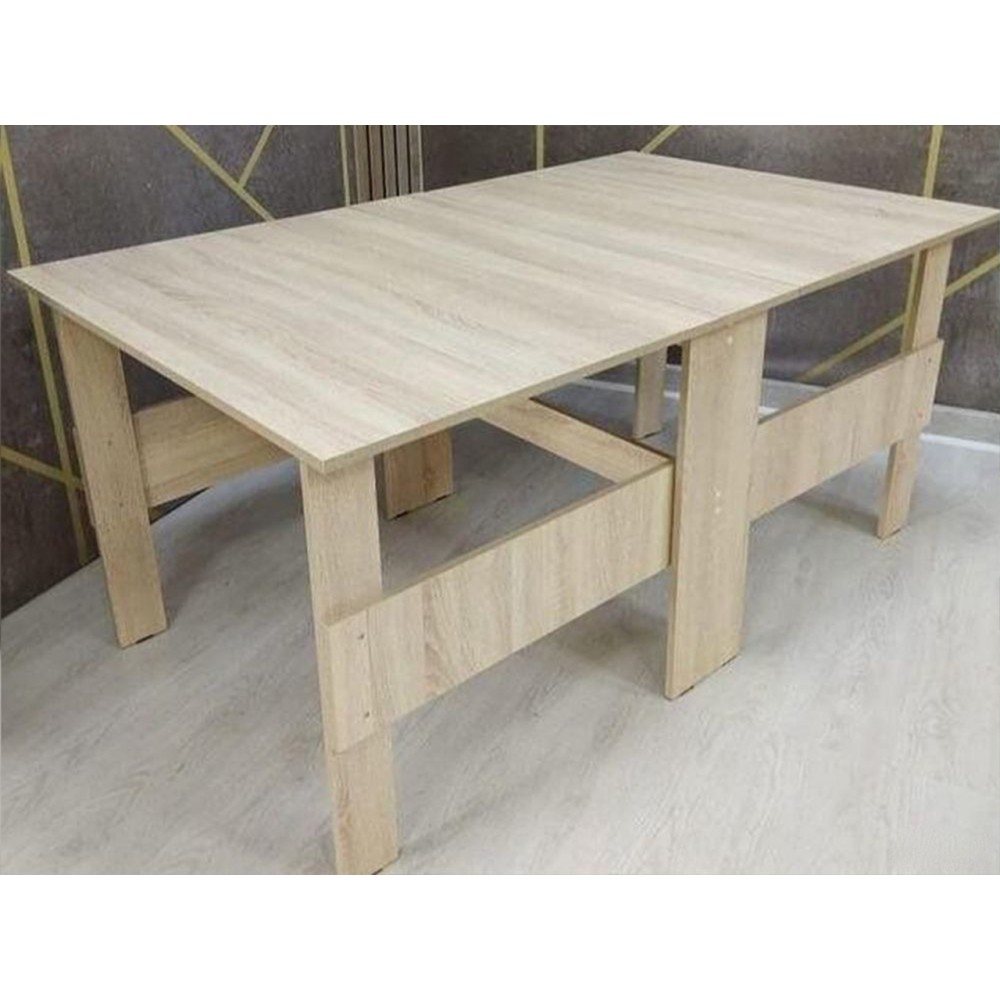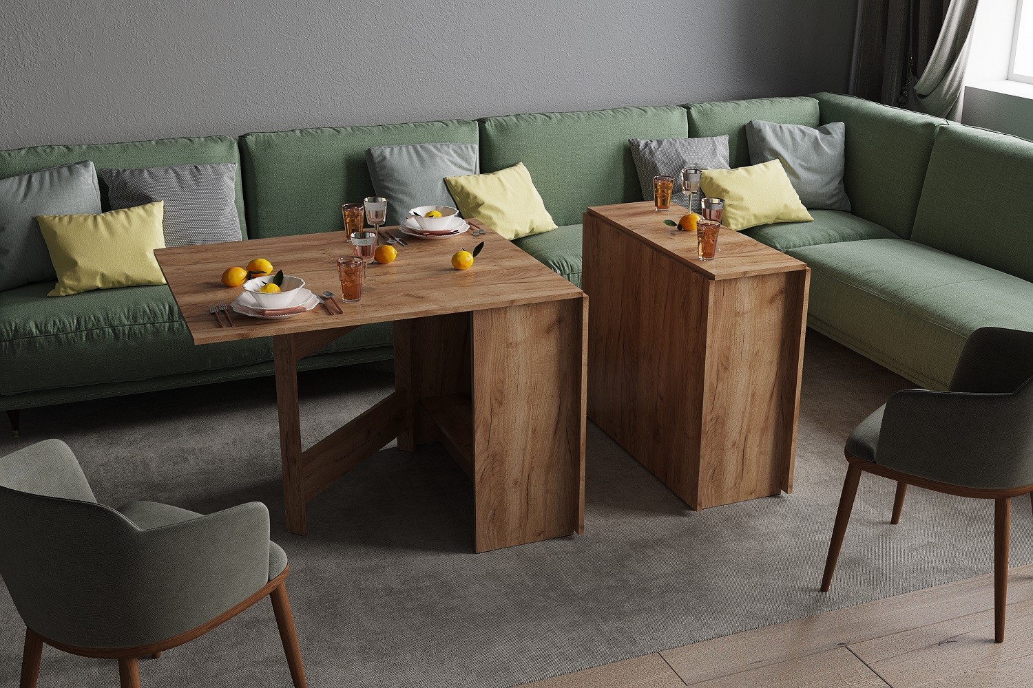 В сложенном состоянии ширина стола составляет всего 25 см, а при необходимости можно быстро и без усилий получить полноценный обеденный стол, приподняв и поставив на ножки боковые части изделия.