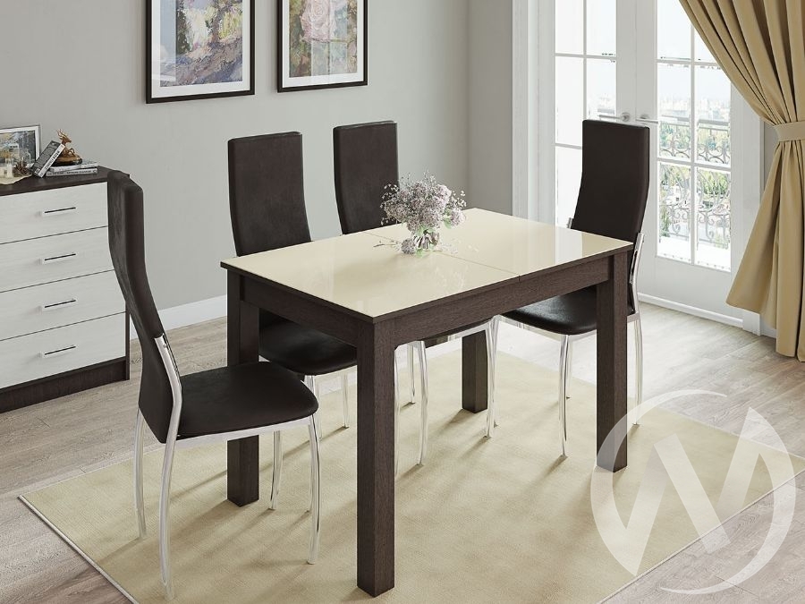 Столешницы выполнены из ЛДСП покрыты стеклом с нанесенным декором Ширина вставки в раскладных столах - 400 мм