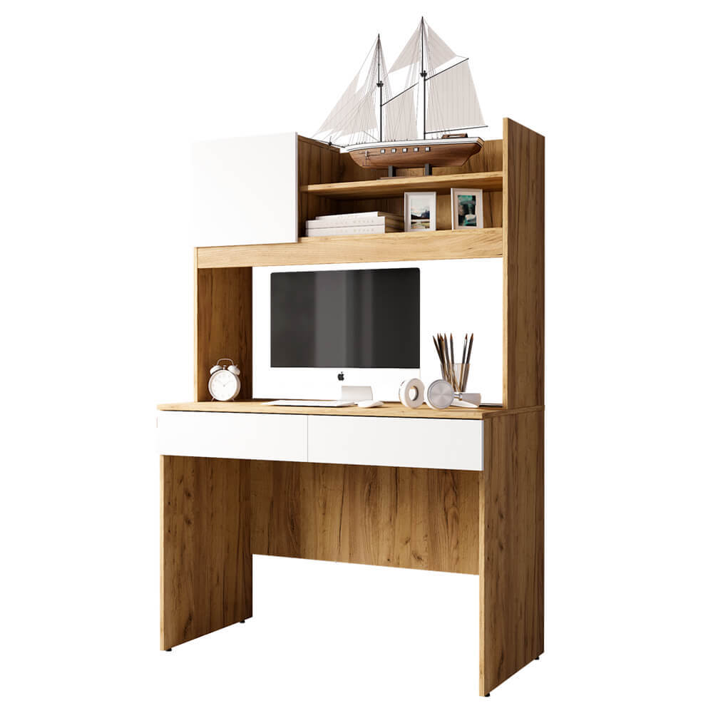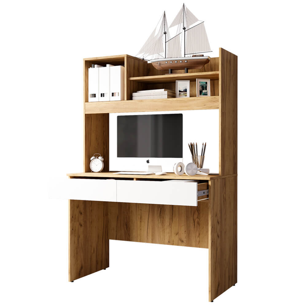 В выдвижных ящиках и нишах над столешницей получится разместить все необходимые для работы или учебы вещи.