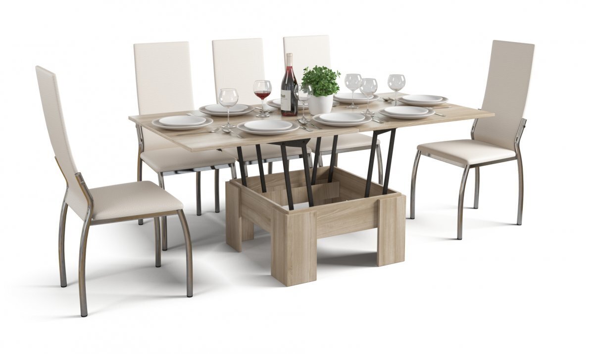 Стол-трансформер – практичное приобретение, выполняющее двойную функцию. В сложенном виде он служит журнальным или письменным столом, занимающим очень немного места в гостиной, а с разложенной столешницей превращается в обеденный стол на 8 персон. Стол оснащен надежным механизмом раскладки и улучшенными креплениями.