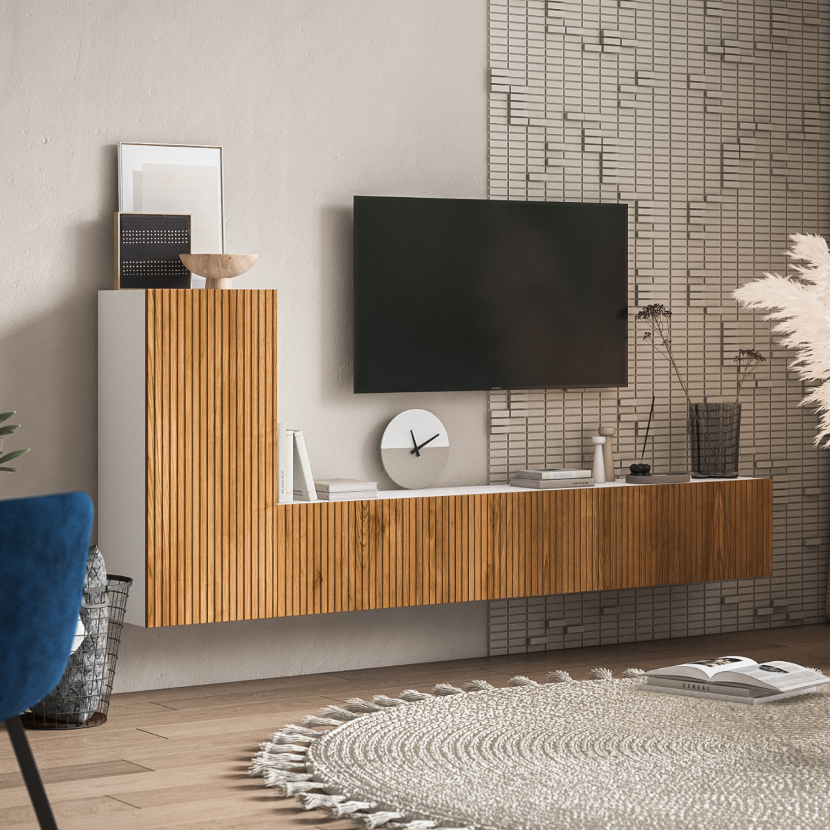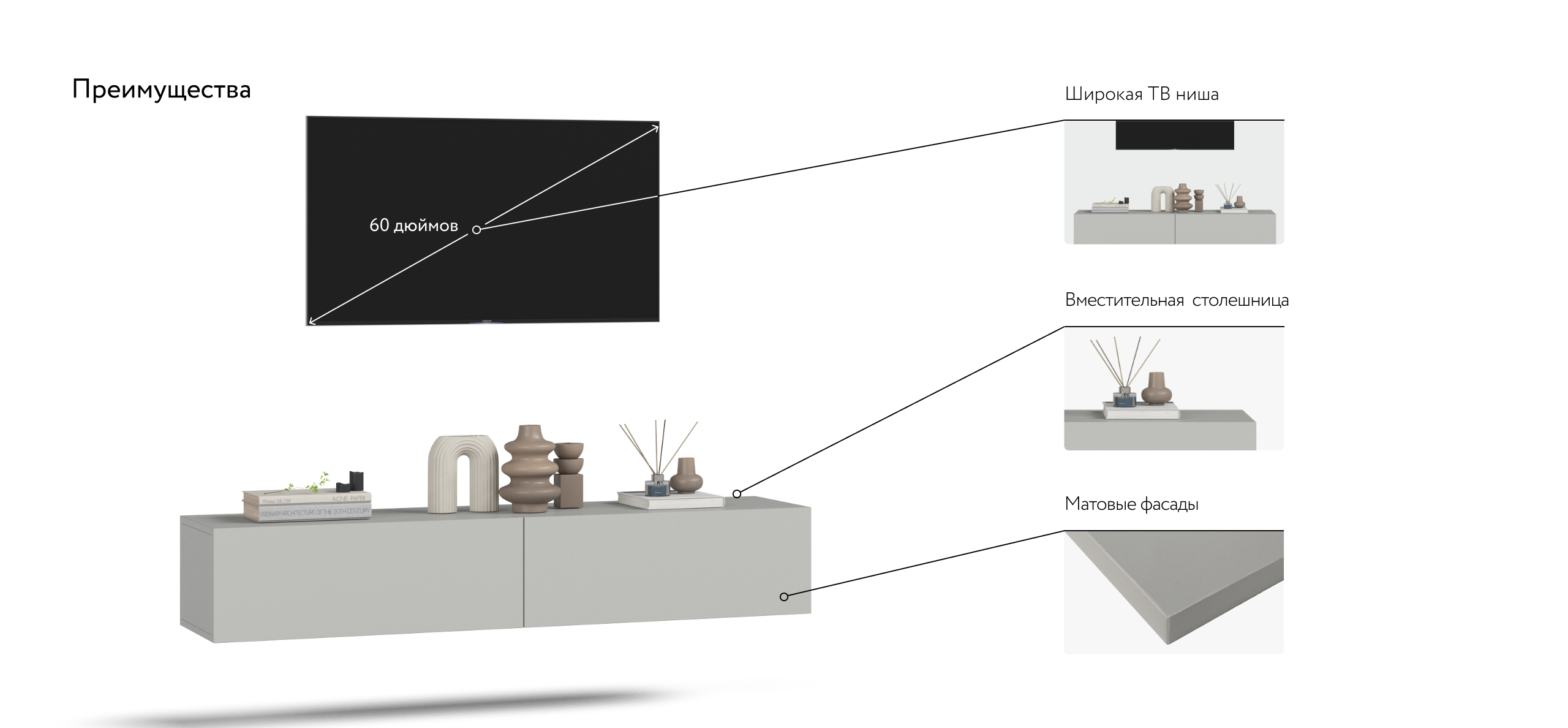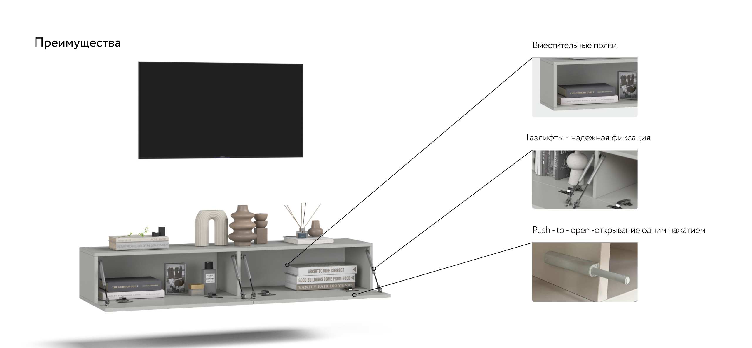 Вместительная ТВ тумба Босс Стандарт 140 с полностью закрытым хранением идеально подходит для хранения личных вещей, ТВ аксессуаров. Тумба оснащена фасадом с подъёмным механизмом, который плавно и бесшумно откидывается вниз, образуя доступ ко всему внутреннему пространству. ТВ Тумба оснащена системой Push-to –open, которая обеспечит легкое открывание дверцы одним нажатием.
