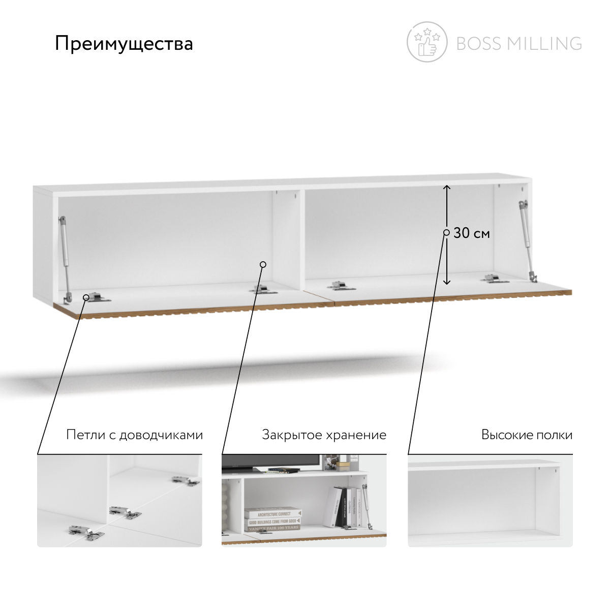 Вместительная ТВ тумба Босс Стандарт 140 с полностью закрытым хранением идеально подходит для хранения личных вещей, ТВ аксессуаров. Тумба оснащена фасадом с подъёмным механизмом, который плавно и бесшумно откидывается вниз, образуя доступ ко всему внутреннему пространству. ТВ Тумба оснащена системой Push-to –open, которая обеспечит легкое открывание дверцы одним нажатием.