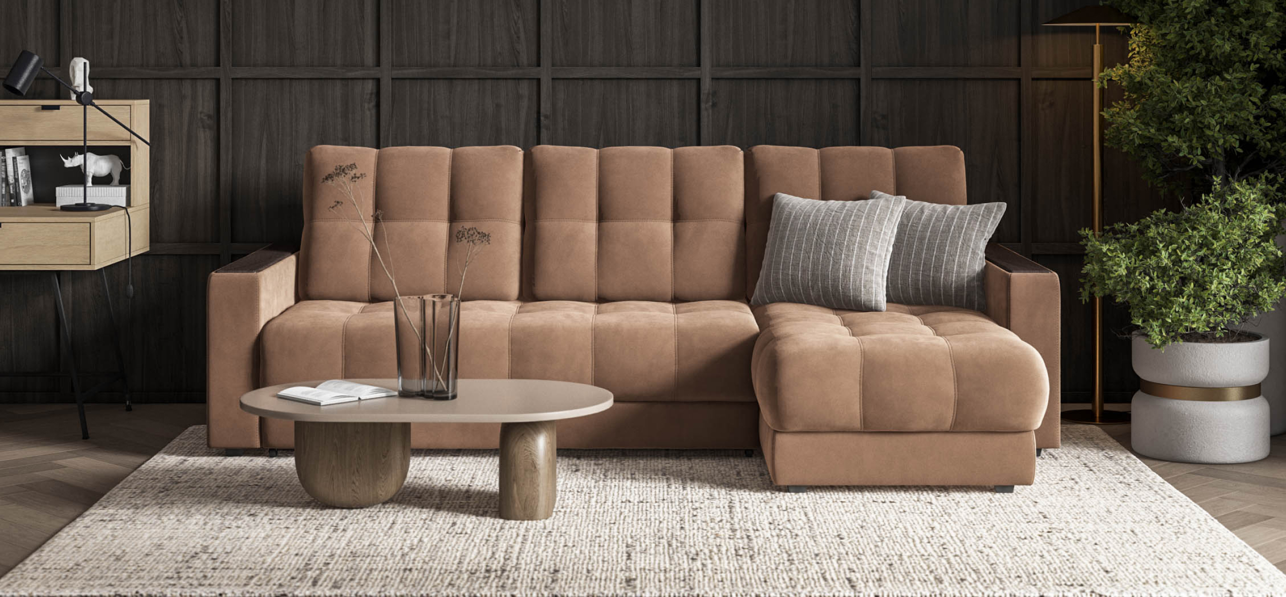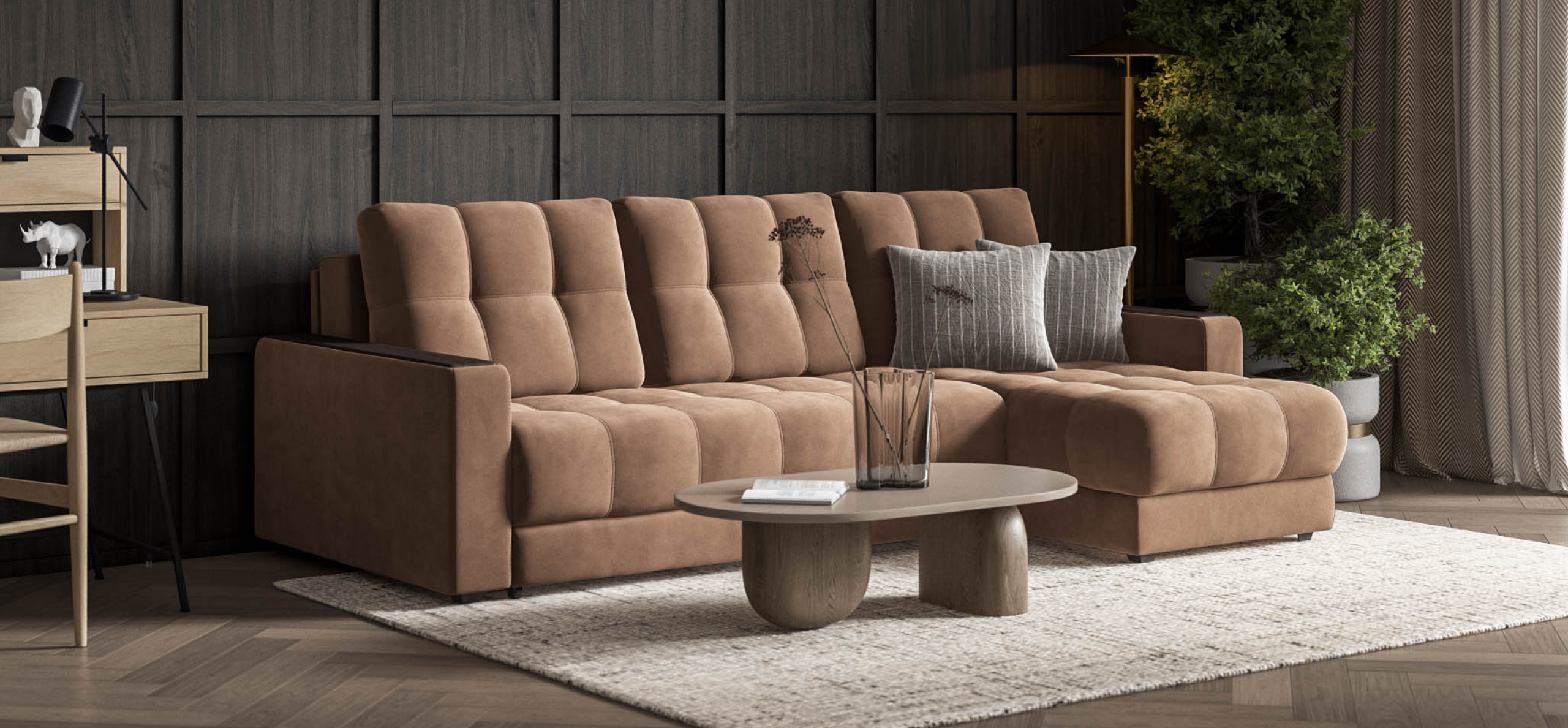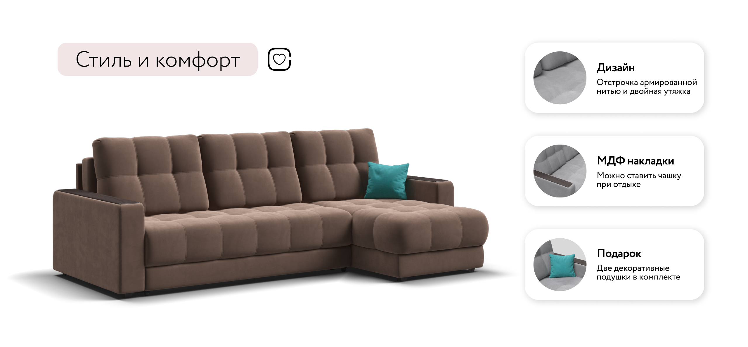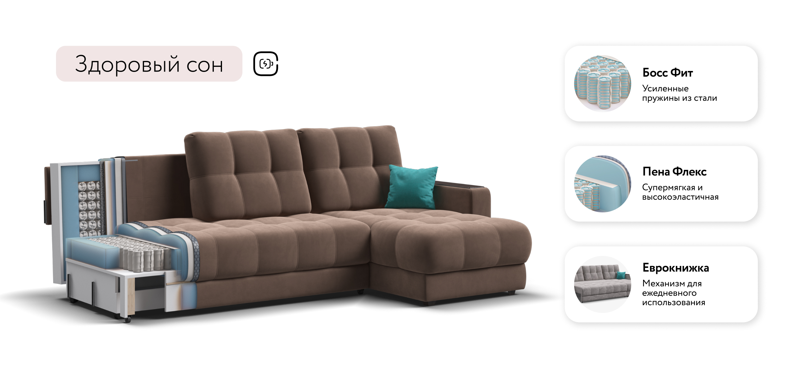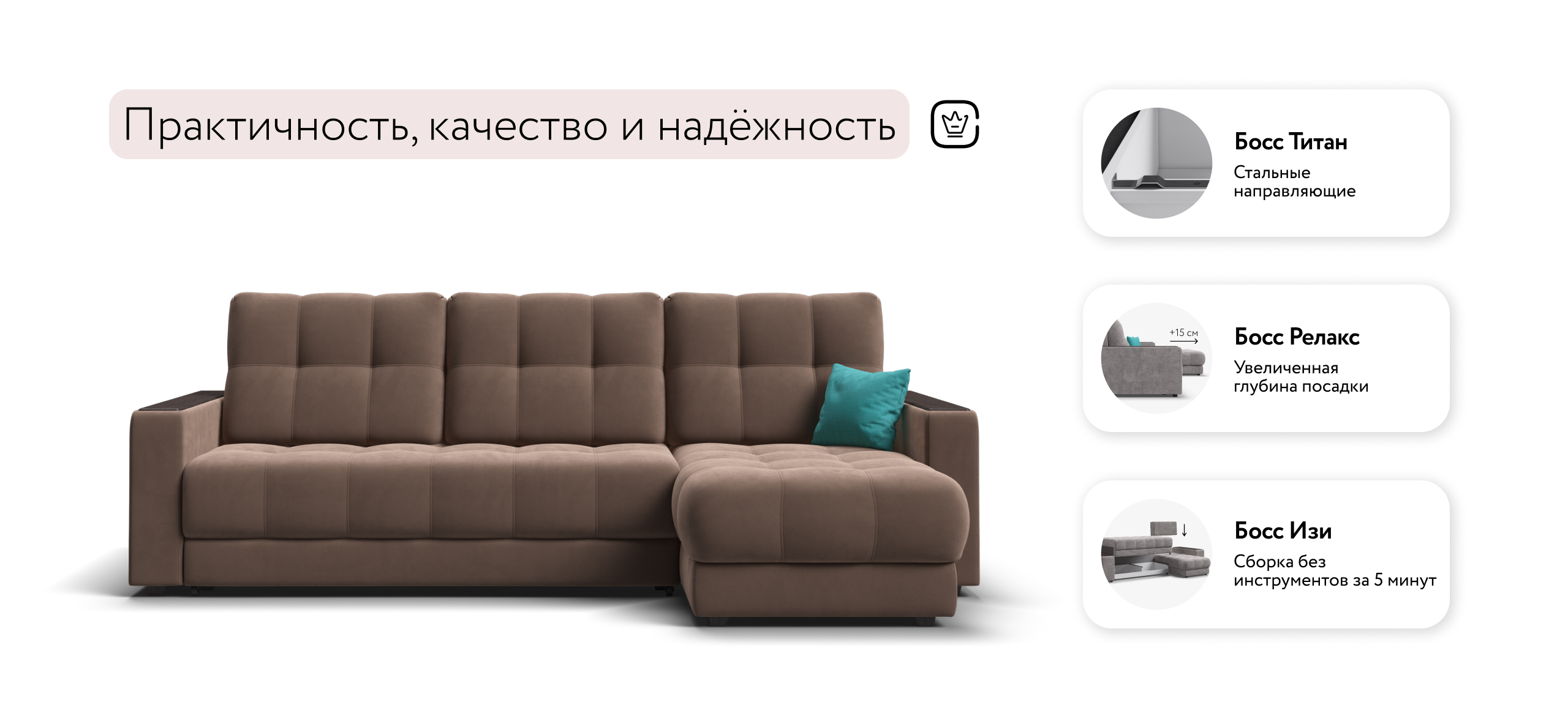 Продуманный до мелочей диван Босс сочетает в себе мягкие ткани, надежный каркас, качественное наполнение матраса и быструю сборку за 1 минуту без инструментов - ощутите комфорт у себя дома!