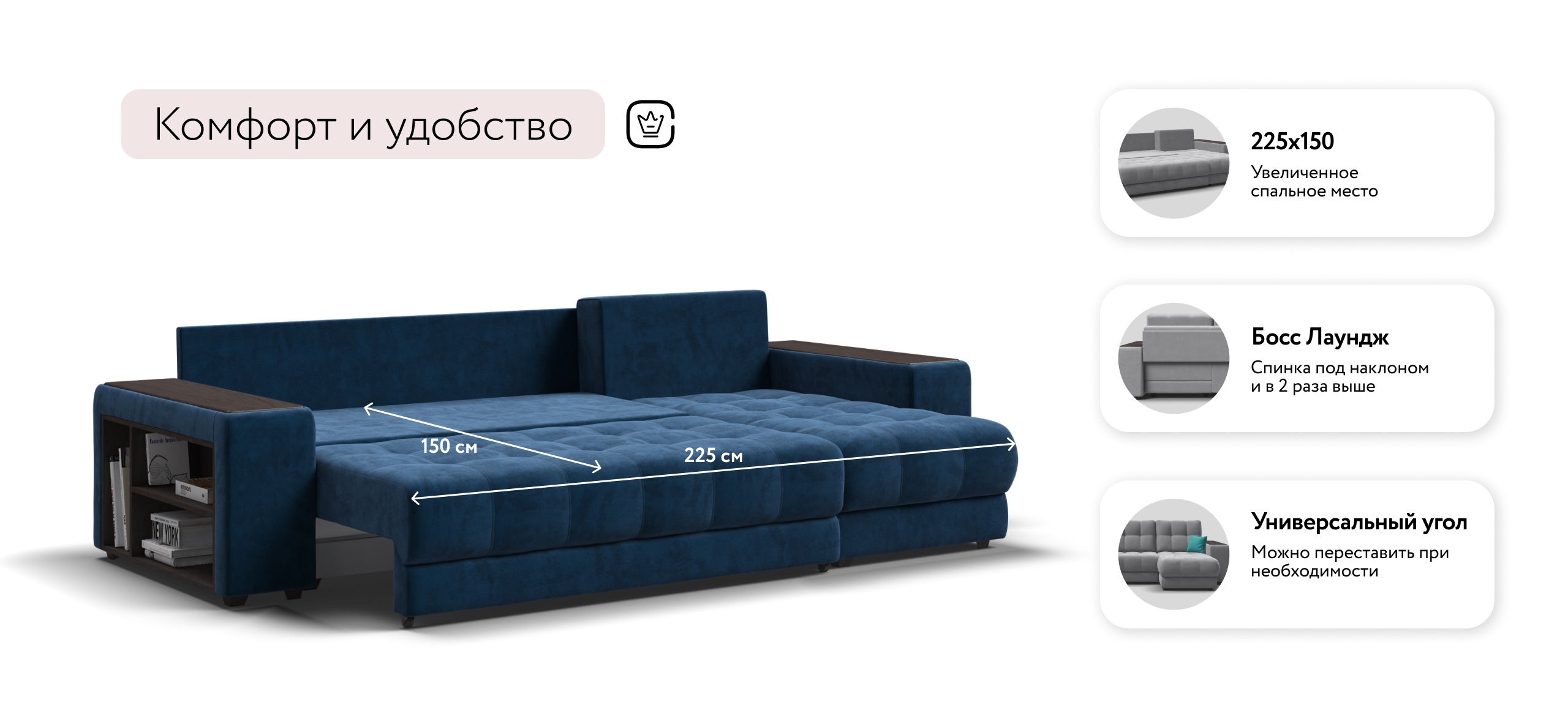 Продуманный до мелочей диван Босс сочетает в себе функциональный подлокотник, мягкие ткани, надежный каркас, качественное наполнение матраса и быструю сборку за 1 минуту без инструментов - ощутите комфорт у себя дома!