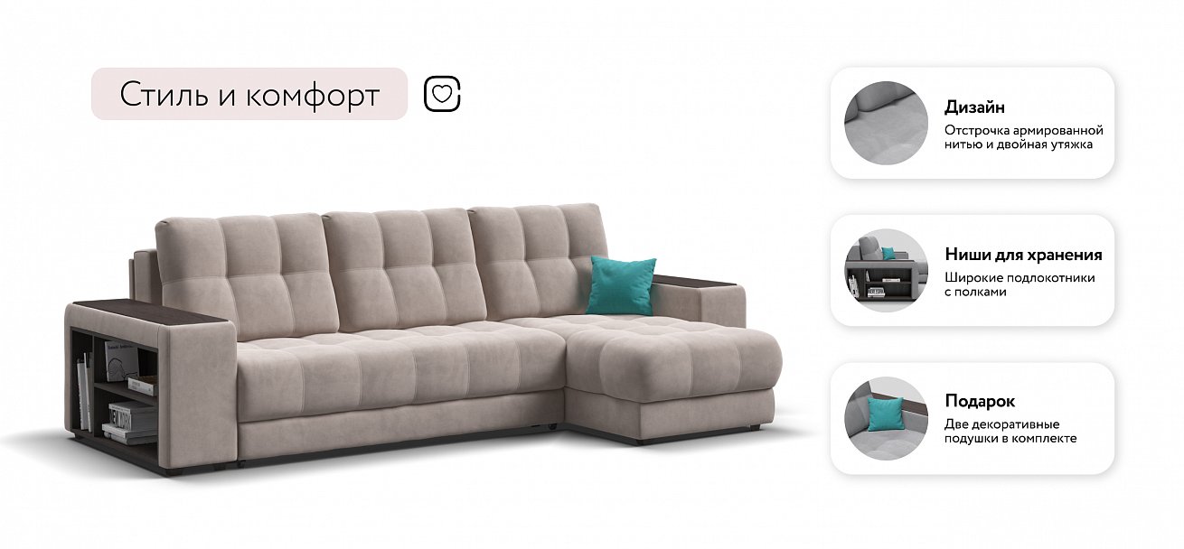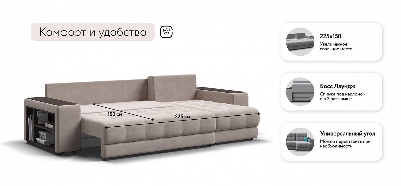 Продуманный до мелочей диван Босс сочетает в себе функциональный подлокотник, мягкие ткани, надежный каркас, качественное наполнение матраса и быструю сборку за 1 минуту без инструментов - ощутите комфорт у себя дома!