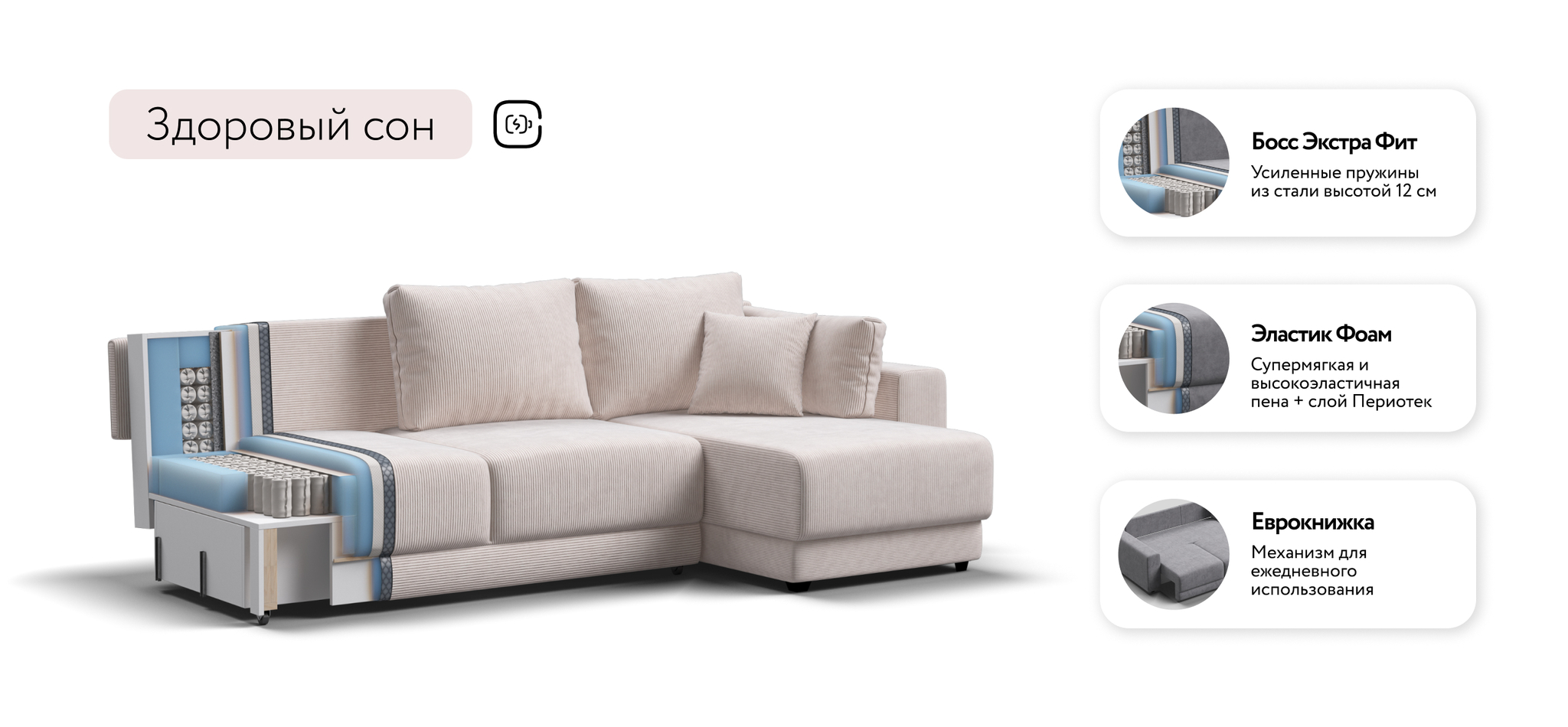 Угловой диван Босс Прайм ХЛ - это сочетание современного дизайна и продуманной эргономики, создающее уютную атмосферу в любом интерьере. Визуально разделённое сиденье, широкие мягкие подлокотники и пышные подушки разного размера обеспечивают не только эстетическую привлекательность, но и максимальный комфорт.​Оснащённый независимым пружинным блоком и высокоэластичной пеной Эластик Фоам с дополнительным слоем периотека, диван гарантирует анатомическую поддержку и комфортный сон. Простой и надёжный механизм трансформации «еврокнижка» позволяет легко преобразовать диван в просторное спальное место.​ Универсальный угол позволит Вам переставить оттоманку и поменять положение угла при необходимости.Угловой диван Босс Прайм ХЛ — идеальное решение для тех, кто ценит стиль, надёжность и уют в каждой детали.