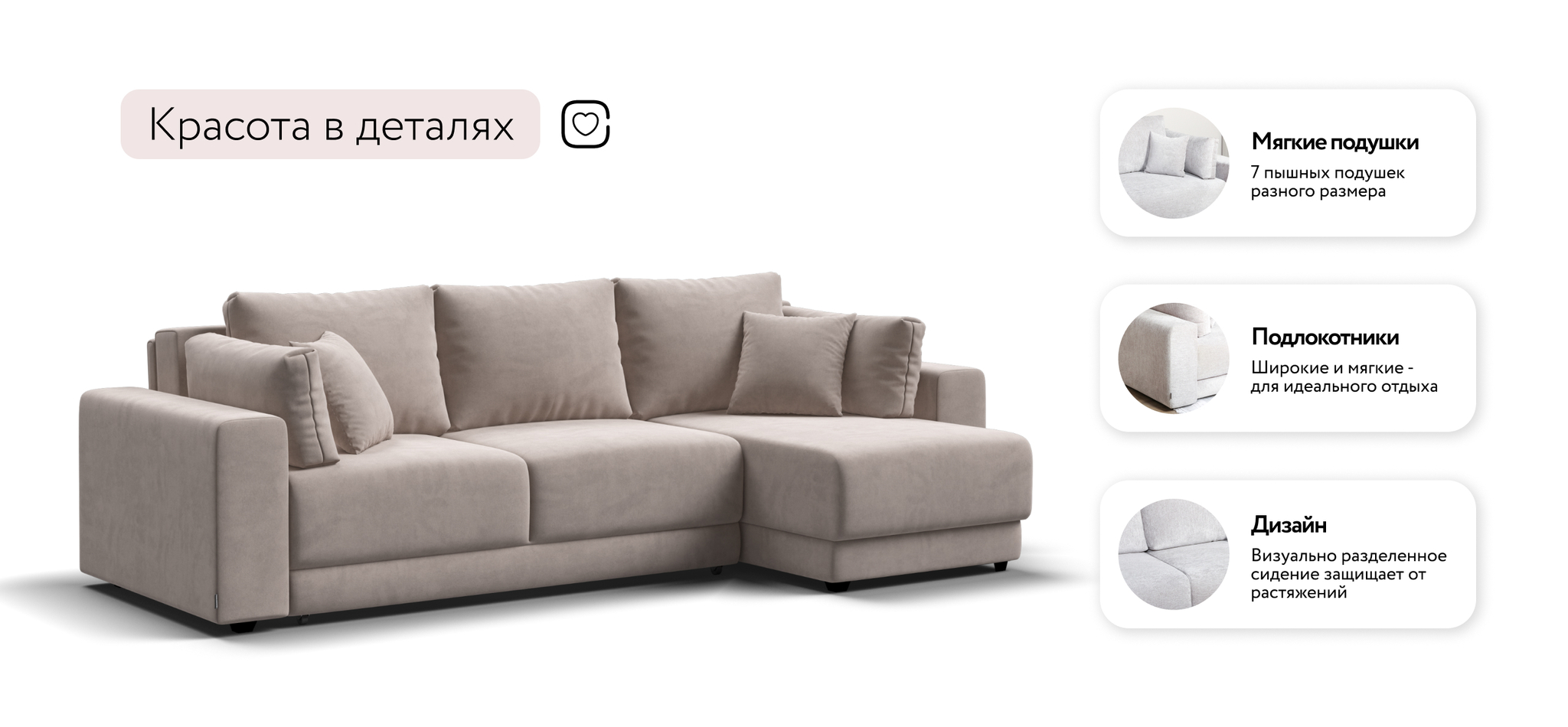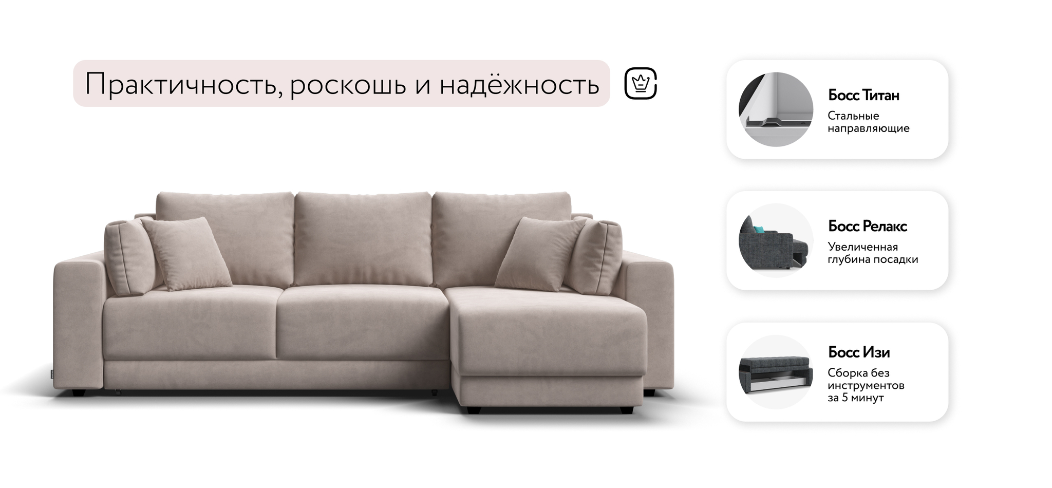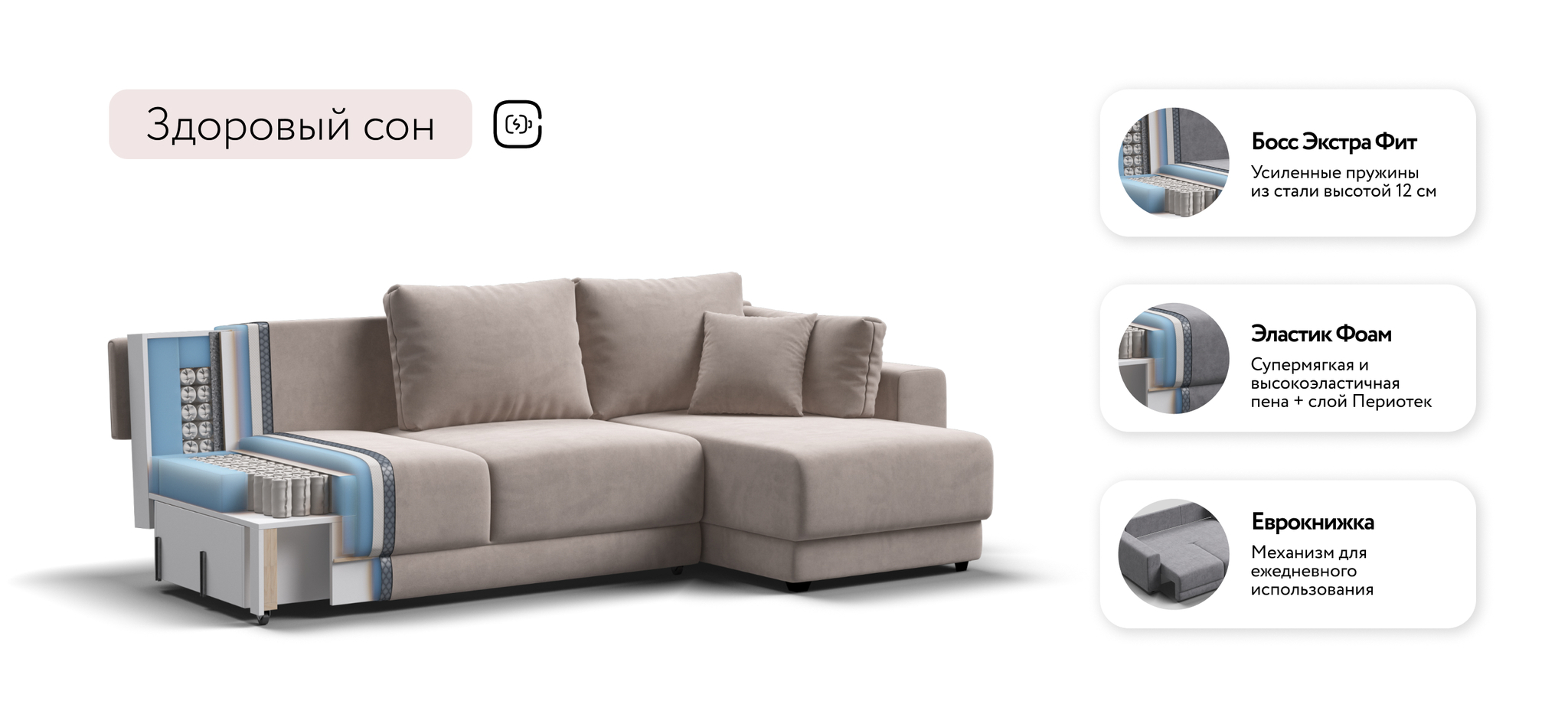 Угловой диван Босс Прайм ХЛ - это сочетание современного дизайна и продуманной эргономики, создающее уютную атмосферу в любом интерьере. Визуально разделённое сиденье, широкие мягкие подлокотники и пышные подушки разного размера обеспечивают не только эстетическую привлекательность, но и максимальный комфорт.Оснащённый независимым пружинным блоком и высокоэластичной пеной Эластик Фоам с дополнительным слоем периотека, диван гарантирует анатомическую поддержку и комфортный сон. Простой и надёжный механизм трансформации «еврокнижка» позволяет легко преобразовать диван в просторное спальное место. Универсальный угол позволит Вам переставить оттоманку и поменять положение угла при необходимости.Угловой диван Босс Прайм ХЛ — идеальное решение для тех, кто ценит стиль, надёжность и уют в каждой детали.