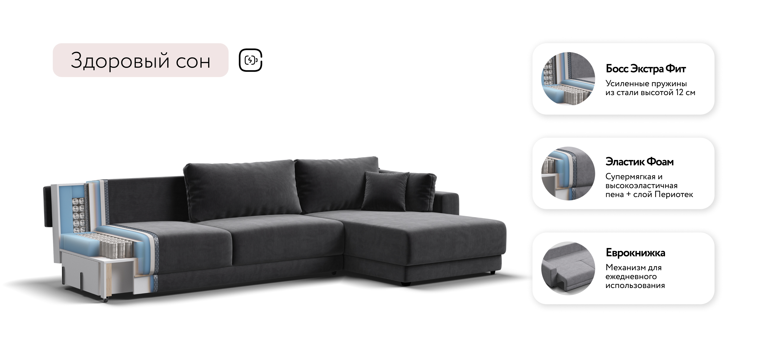 Оснащённый независимым пружинным блоком и высокоэластичной пеной Эластик Фоам с дополнительным слоем периотека, диван гарантирует анатомическую поддержку и комфортный сон. Простой и надёжный механизм трансформации «еврокнижка» позволяет легко преобразовать диван в просторное спальное место.​ Универсальный угол позволит Вам переставить оттоманку и поменять положение угла при необходимости.