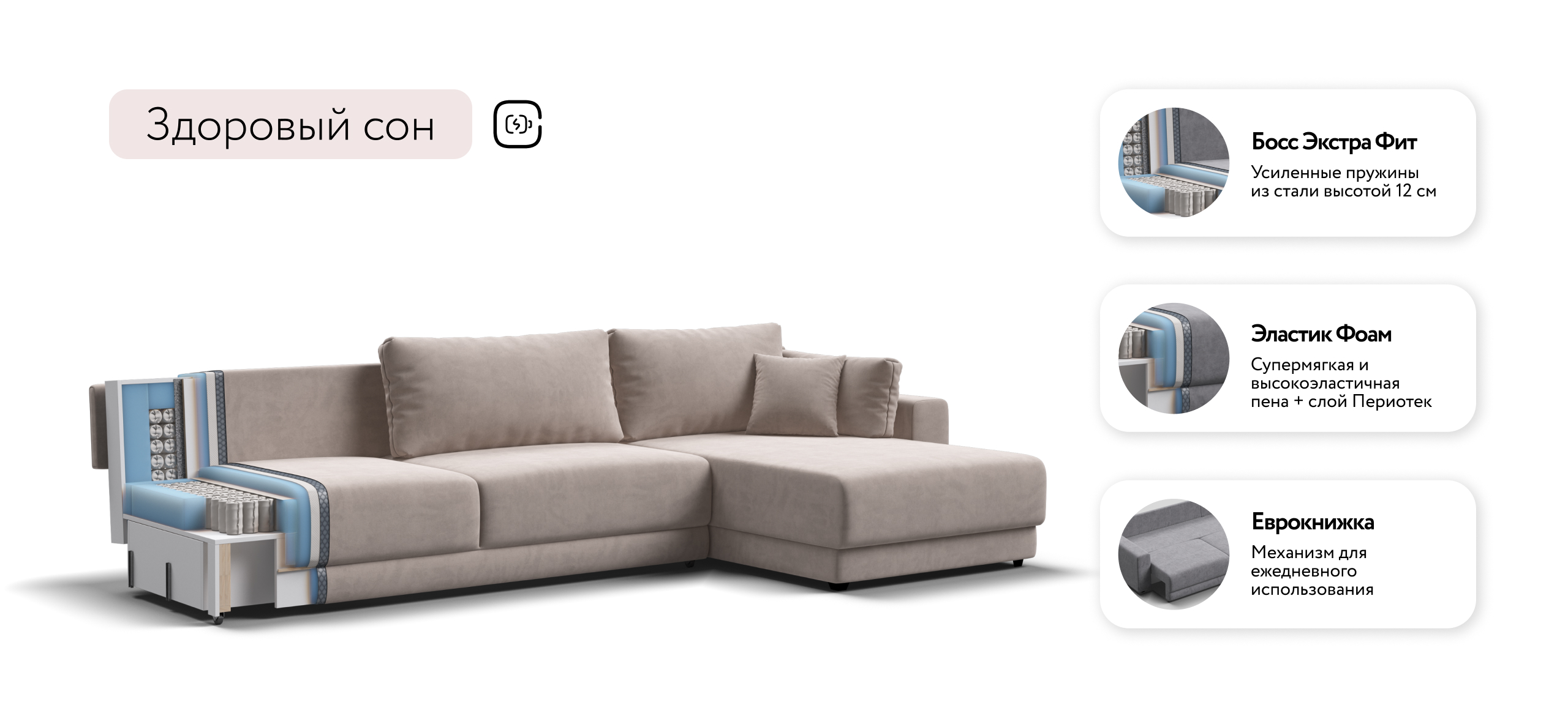 Оснащённый независимым пружинным блоком и высокоэластичной пеной Эластик Фоам с дополнительным слоем периотека, диван гарантирует анатомическую поддержку и комфортный сон. Простой и надёжный механизм трансформации «еврокнижка» позволяет легко преобразовать диван в просторное спальное место. Универсальный угол позволит Вам переставить оттоманку и поменять положение угла при необходимости.