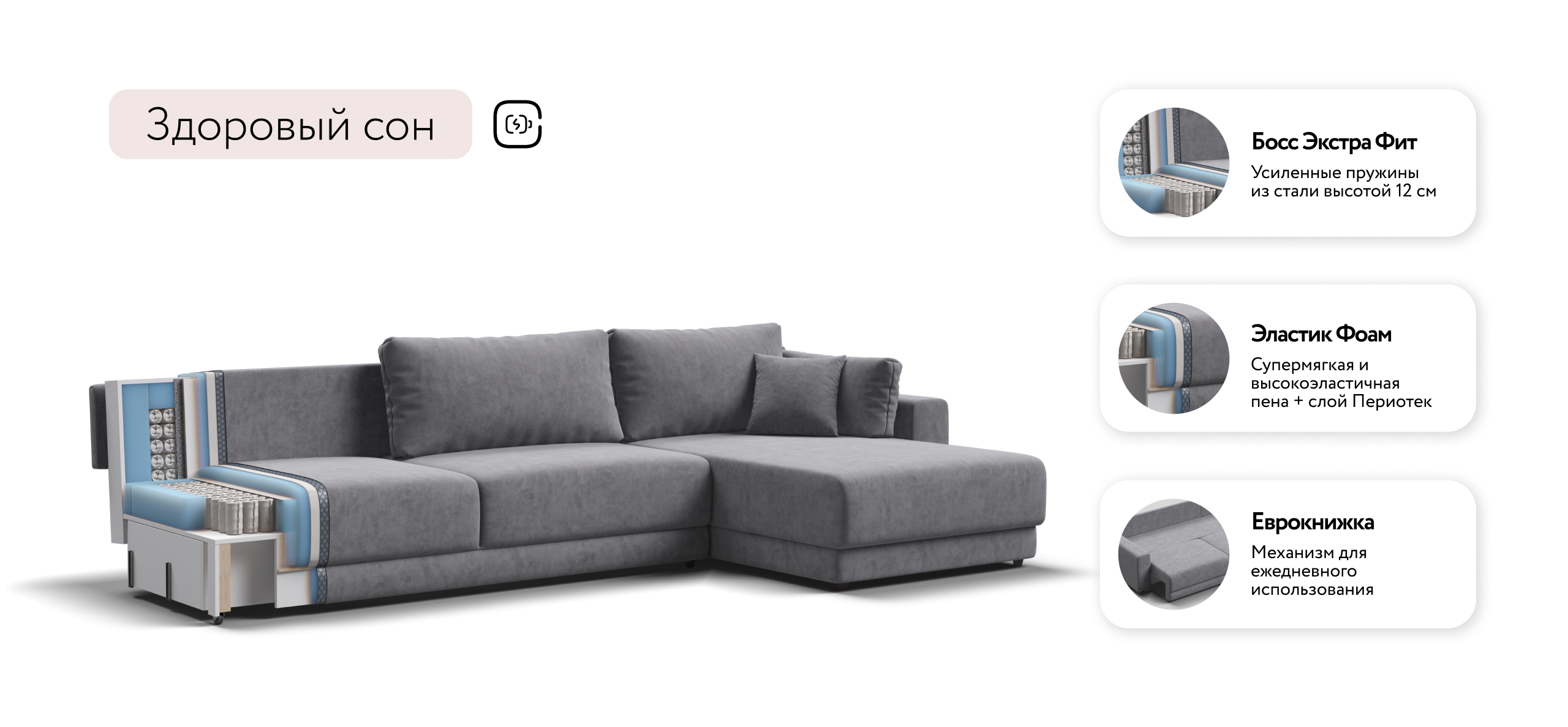 Оснащённый независимым пружинным блоком и высокоэластичной пеной Эластик Фоам с дополнительным слоем периотека, диван гарантирует анатомическую поддержку и комфортный сон. Простой и надёжный механизм трансформации «еврокнижка» позволяет легко преобразовать диван в просторное спальное место.​ Универсальный угол позволит Вам переставить оттоманку и поменять положение угла при необходимости.