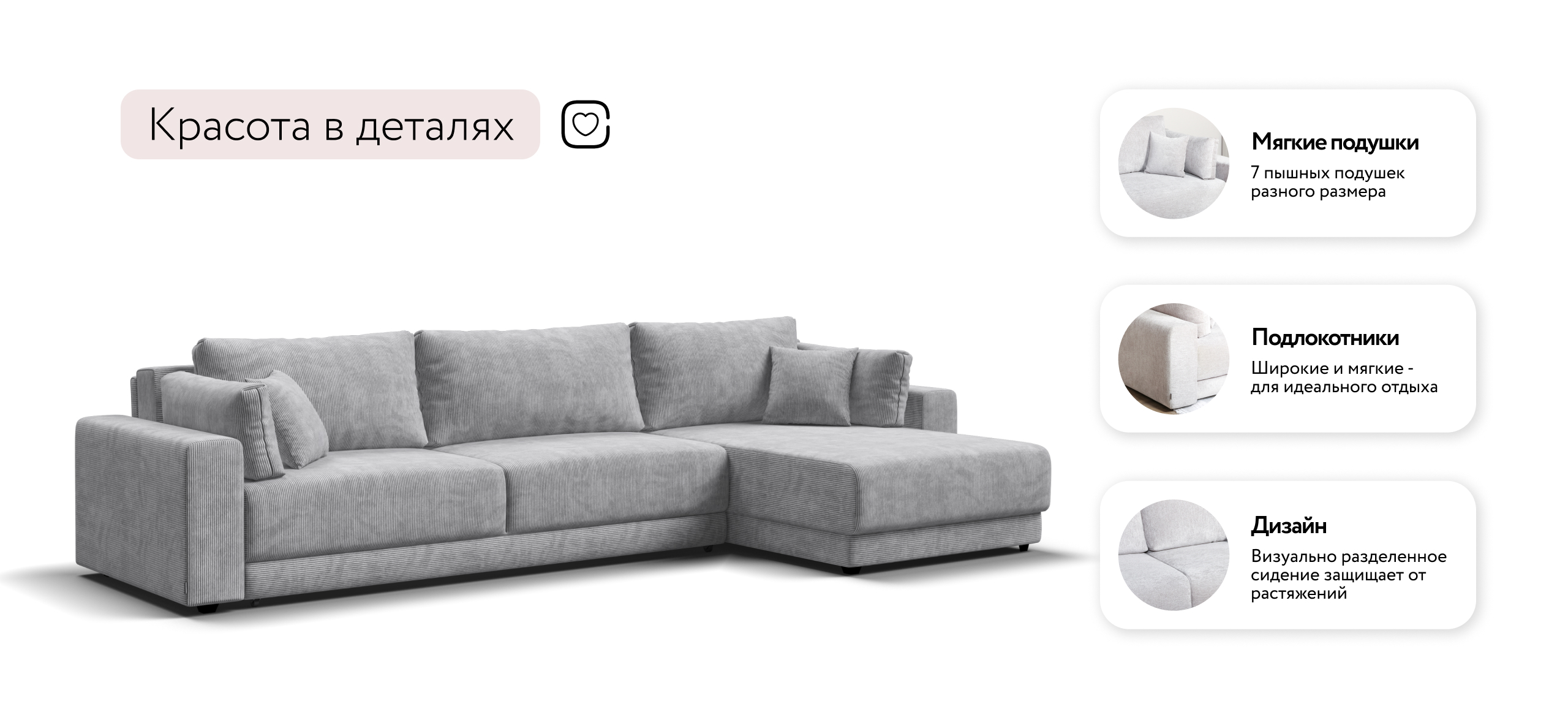 Угловой диван Босс Прайм Макс - это сочетание современного дизайна и продуманной эргономики, создающее уютную атмосферу в любом интерьере. Визуально разделённое сиденье, широкие мягкие подлокотники и пышные подушки разного размера обеспечивают не только эстетическую привлекательность, но и максимальный комфорт.