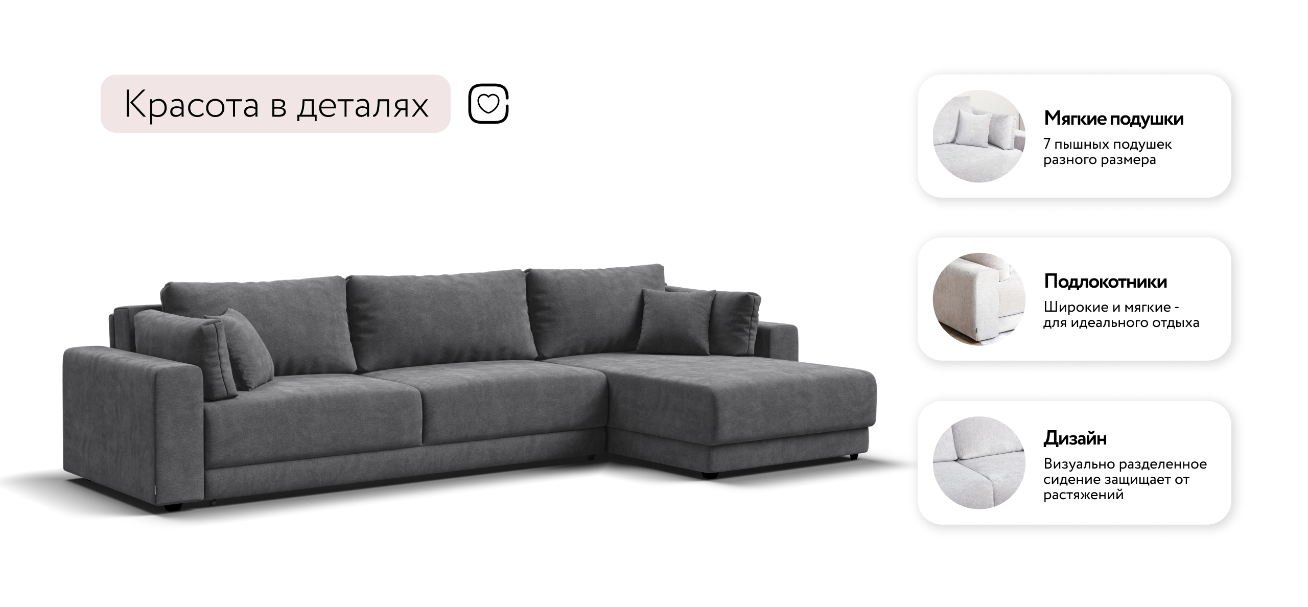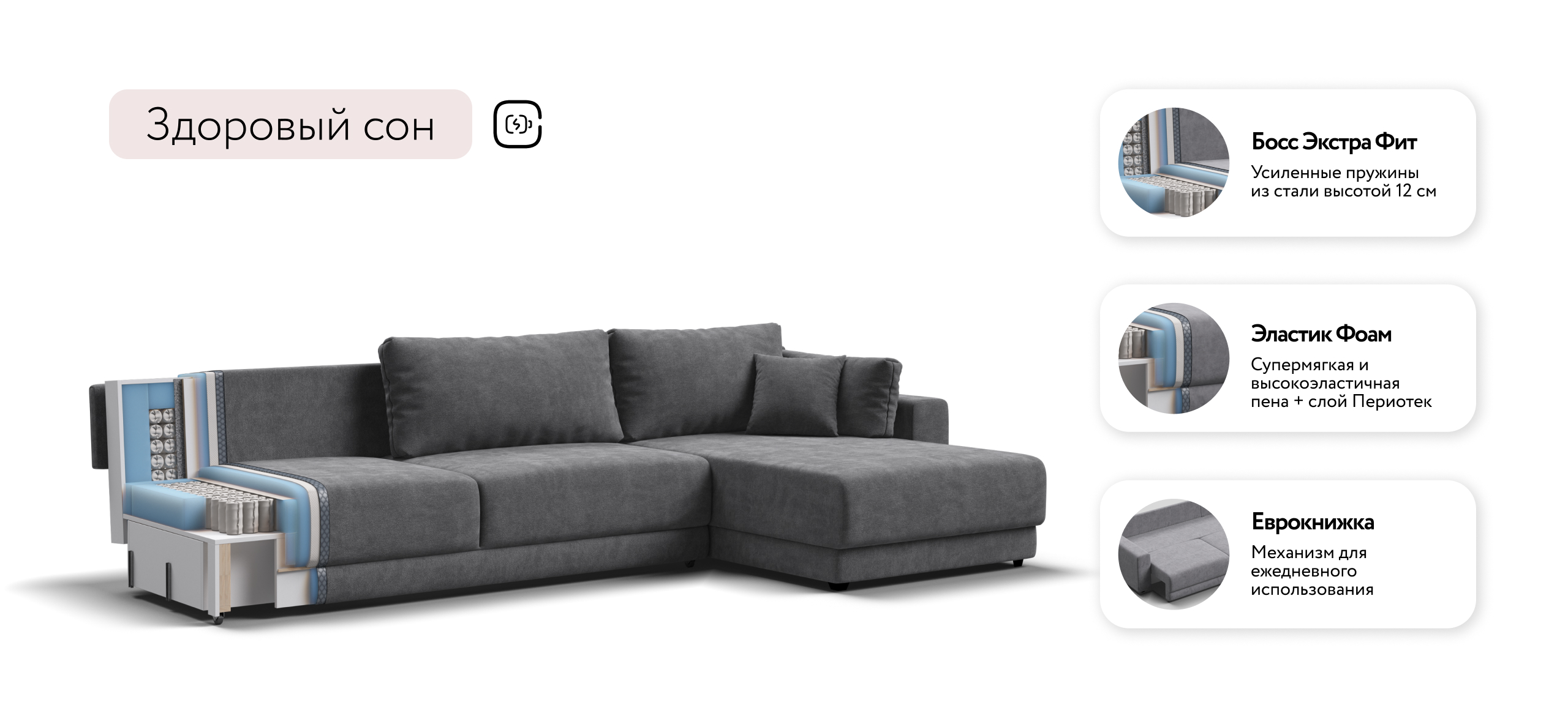 Угловой диван Босс Прайм Макс - это сочетание современного дизайна и продуманной эргономики, создающее уютную атмосферу в любом интерьере. Визуально разделённое сиденье, широкие мягкие подлокотники и пышные подушки разного размера обеспечивают не только эстетическую привлекательность, но и максимальный комфорт.Оснащённый независимым пружинным блоком и высокоэластичной пеной Эластик Фоам с дополнительным слоем периотека, диван гарантирует анатомическую поддержку и комфортный сон. Простой и надёжный механизм трансформации «еврокнижка» позволяет легко преобразовать диван в просторное спальное место. Универсальный угол позволит Вам переставить оттоманку и поменять положение угла при необходимости.Угловой диван Босс Прайм Макс — идеальное решение для тех, кто ценит стиль, надёжность и уют в каждой детали.