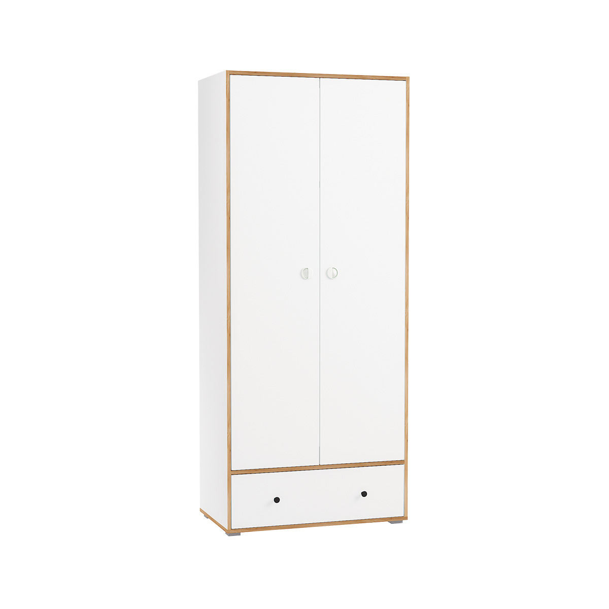 Также имеются письменный стол с надстройкой и полкой, шкафная группа и комод с тумбочкой. Вместе они позволяют создавать разноразмерные композиции. На распашных фасадах шкафа белые пластиковые врезные ручки.